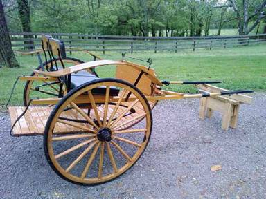 Here is my lovely Meadowbrook that my favorite engineer restored. This was purchased in 1998 from an old friend, Gunilla, while we were attending Equitana together. One shaft was replaced, all the wood was sanded, stained, and sealed with polyurethane. All of the vinyl trim was replaced, and the seats cleaned. The rein rail, whip holder, and the shaft tips, will be replaced with chrome. The cart will be re-upholstered with brown on the seats and the shafts. |