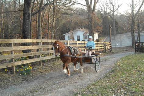 CCR Doll Box, or “Doll”, was purchased from Castleberry Cobs of Indiana. You want a great pony? Talk to Lisa. This is taken at our farm in East Tennessee, where Doll and I are returning from our 1 mile drive. This is the road cart that Richard restored. The new harness is Driving Essentials harness: Essential Plus 4” saddle with sliding backband and padded skirts, Marathon tugs-LOVE!, padded Marathon breastcollar and breeching, A false martingale (unfortunately a tear drop got added), and no decorative brow band on the Marathon bridle. |