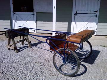 This road cart defiantly had problems when first purchased from a lady in Kentucky. The shafts had been shortened, and signs of a major crash was evident. My favorite engineer, Richard, put in back in shape, grinded some bad welding and paint jobs, to the wonderful cart you see today. The seat is removable and is leather with sewn mitered corners. The original steel u-channeled rim wheels were replaced with newer c-channeled rims. U-channels tend to ‘pop’ the bead. This cart should never be driven on rough ground; you’d bounce too much. |