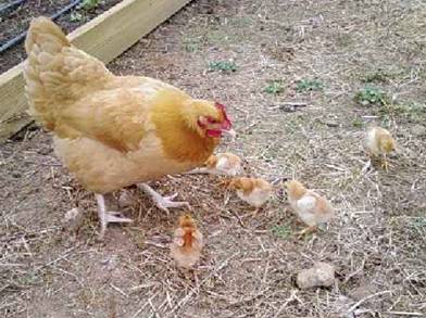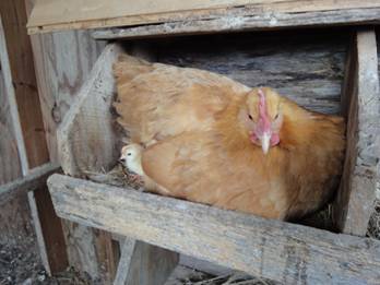 The Buff Orpington is prone to broodiness. One of our hens went broody just after 4 eggs left overnight in a nesting box. Seeing as we lost our sweet rooster ,“SNOOZE”, none of the eggs were fertile. Therefore, we went to Craigslist and got some fertile Rhode Island Red eggs. |