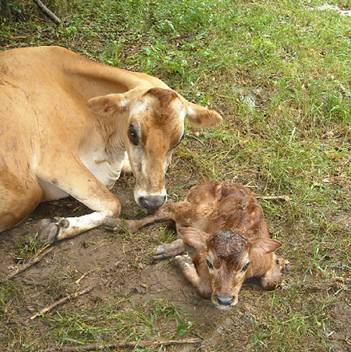 Lucy is a sweetly tempered cow and a very protective mother. Here she is with “Little Moo”, her bull calf calved in August 2009. She is a registered American Jersey. Her sire is Sunset Canyon Mecca-ET, her dam is PR Berretta Hess We used the following “milk share” program: The calf nursed the first day. By the second day, Lucy was lightly milked two times a day, that means about 5 minutes with a bucket milker for four days. The colostrum can be saved and frozen in sanitized plastic milk jugs. On the fifth day, time of milking was increased slowly so that by one month after calving, it has been increased to 8 minutes. The calf will strip out the udder so that the risk of mastitis is lowered. |