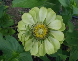 Green Lynx spider with ‘Envy’ Zinnia, purchased from Renee's Garden Seeds, in our kitchen garden