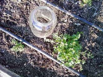 Parsley plant on right had cloche, no lid, placed on it in February 09, the other two plants, one left one upper right were not covered. |