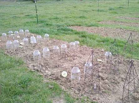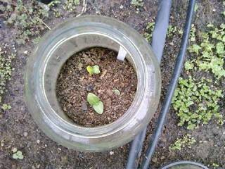 This demonstrates the real ability of cloches to create an hospitable environment for not only forcing early growth, but getting cool and warm season crops a head start in the growing season. The un-lidded cloches will remain until the weather stabilizes or the plant begins to outgrow the cloche. Three weeks before last possible frost date in Middle Tennessee, the Corno di Toro sweet peppers are under their cloches. The Sierra Fuego jalapeño, San Luis ancho, ‘Joe Parker’ Santa Fe chile, and the green and purple tomatillos will be planted in the garden under cloches Easter weekend; this will be 2 weeks before last possible frost-April 16 for Nashville, TN. Seedlings were started 3/04 in cells under one 55 watt compact fluorescent bulb. Although the risk of frost is minimal, the cloches will serve as a ‘terrarium’, as Richard likes to call them, for the warm climate crops for about 2 weeks AFTER the last possible frost. The zucchini were seeded into plastic pots and sunk into the ground before being covered with the lidded cloche one month before last possible frost date. They will also be placed in their permanent position in the vegetable garden during the Easter weekend. The Raven cultivar seemed to do better than the Golden Dawn. When I say ‘LIDDED’ this means that when the temperatures are above 35°F, remove the lids during the day and cover during the nights. Once sprouting is seen, it is best to keep cloches unlidded during the day so that the seedlings do not get baked. The cloches are made from Mt. Olive Kosher Dill Pickle jars. Our two younger children absolutely love these pickles, so we have a steady supply of cloches. Richard removes the bottoms with a diamond saw. Be very careful, because they will shatter and are sharp on the cut edge. These are only for use by competent, intelligent adults. One week before last possible frost date, the melons and Japanese cucumbers will be planted under a cloche in the vegetable, a.k.a. ‘canning’, garden. |