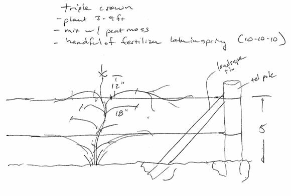 At one time, our farm had over 4 acres in blackberries. However, there was no irrigation established by the growers, and with blackberries being a shallow rooted plant, the plants died. We have begun replanting by first establishing 50 plants of Triple Crown, a cultivar recommended by Richard’s family at Huber’s Orchard. In Autumn 2009, the grass was killed by an application of Round-up™. The plants were planted early March 2010 and placed in holes dug 2 feet apart with the soil amended with two handfuls of peat moss in each. The trellis system chosen was two-wire system. The canes were cut to 6” and watered. |
